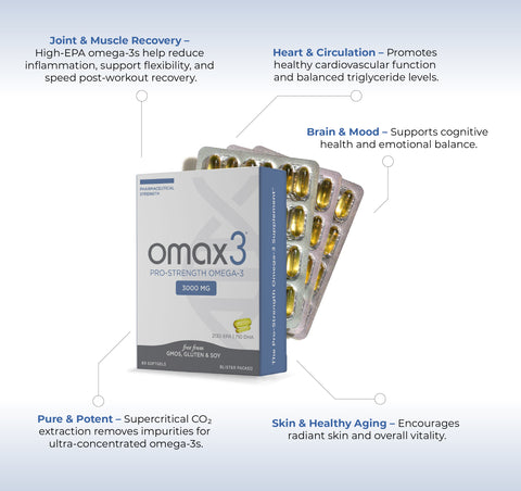Our professional strength omega 3 supplement is one of the most concentrated fish oils on the market today. Used by professional sports teams, chiropractors and healthcare practitioners, Omax3 Pro contains 1,000 mg of omega 3 in each softgel. The high concentration of EPA to DHA is perfect to resolve inflammation and recover sore muscles and joints.