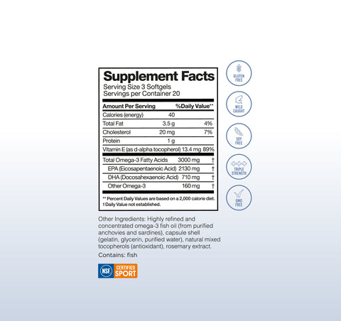 Highly concentrated omega 3 supplement with high EPA for inflammation support, joint health and muscle recovery. Contains 1000 mg of omega 3 per softgel. 60 softgels per box.