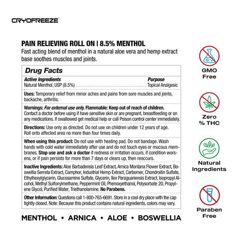 Omax Cryofreeze Pain Relief Roll-On offers temporary relief from minor aches and pains from arthritis, backache, and sore muscles and joints. The main active ingredient is 8.5% Menthol which provides an instant topical cooling effect. It includes a healing blend of Broad-Spectrum Hemp Oil CBD, Menthol, Peppermint, Aloe Vera, Arnica, Ilex, Boswellia, Glucosamine, Chondroitin and Camphor. The power packed ingredients help block feelings of pain and support muscle and joint flexibility.